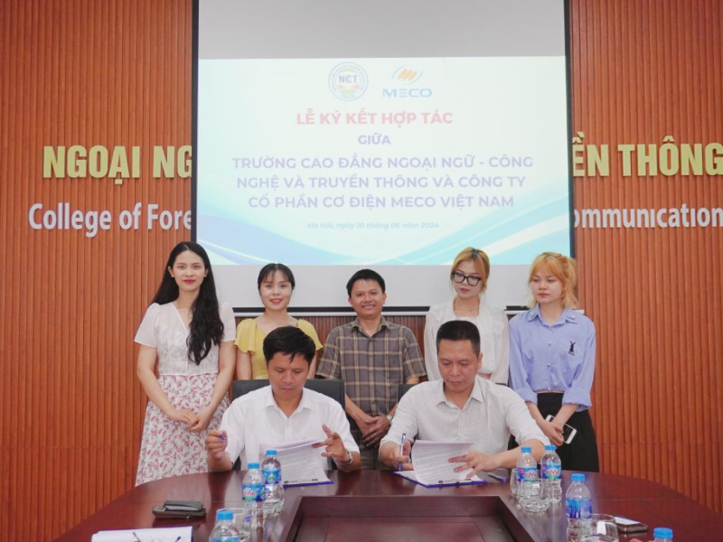 Ngày 10/06/2024, Trường Cao đẳng Ngoại ngữ – Công nghệ và Truyền thông (NCT College) đã tổ chức buổi làm việc và ký kết hợp tác chiến lược với Công ty Cổ phần Cơ điện Meco Việt Nam. Thỏa thuận này hướng tới mục tiêu tăng cường gắn kết giữa nhà trường và doanh nghiệp, triển khai các chương trình đào tạo thực tiễn, đồng thời tạo cơ hội việc làm ổn định cho sinh viên sau khi tốt nghiệp.