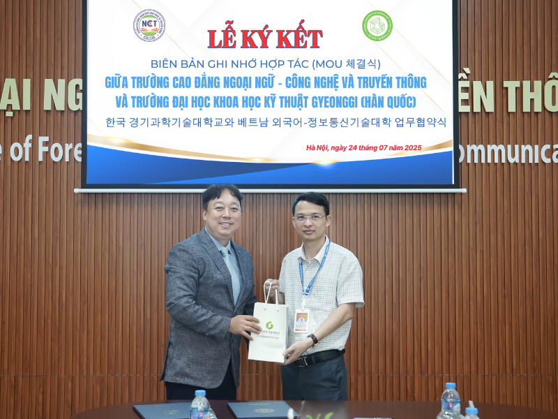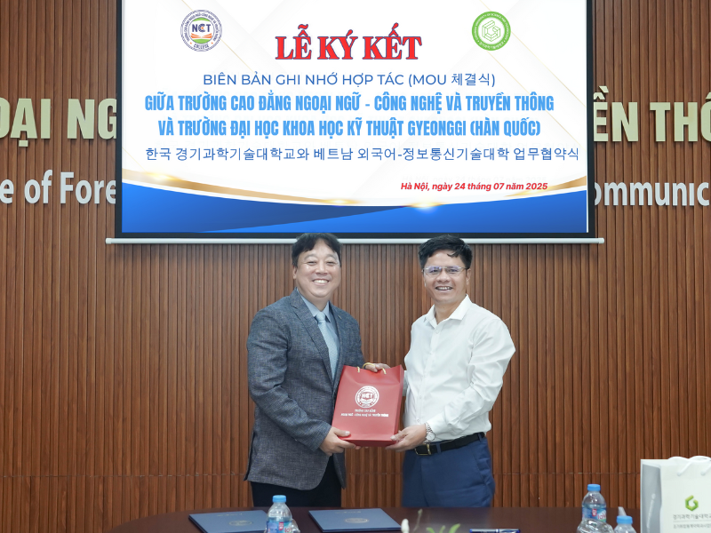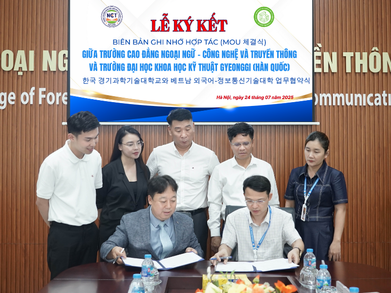 Ngày 24/7/2025, Trường Cao đẳng Ngoại ngữ – Công nghệ và Truyền thông (NCT College) đã chính thức ký kết Biên bản ghi nhớ hợp tác (MOU) với Trường Đại học Khoa học Kỹ thuật Gyeonggi (GTEC) – Hàn Quốc.