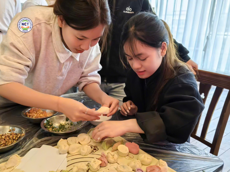 Trong khuôn khổ chương trình học tập và trải nghiệm quốc tế tại Trung Quốc, sinh viên Trường Cao đẳng Ngoại ngữ – Công nghệ và Truyền thông (NCT) đã có cơ hội tham gia lớp học làm bánh sủi cảo truyền thống – một hoạt động mang đậm bản sắc văn hóa Trung Hoa. Chương trình không chỉ giúp sinh viên nâng cao năng lực tiếng Trung mà còn tạo điều kiện để các bạn trực tiếp trải nghiệm đời sống, văn hóa bản địa, đúng với định hướng đào tạo “học đi đôi với hành” mà NCT luôn chú trọng.